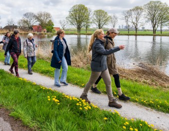 De gids vertelt over de geschiedenis en de natuur van dit gebied. Zo wijst hij op de historische banpaal die vroeger de grens van het rechtsgebied van de stad Amsterdam aangaf. Voorbij deze paal mochten verbannen personen niet komen. In de lagergelegen Middelpolder, ontstaan door de afgraving van veengrond, wemelt het van de vogels. Een ganzenpaar met een rijtje vroege pulletjes gaat veelvuldig op de foto, iemand signaleert een blauwborstje en de tjiftjaf is overal te horen. Iedereen geniet van de wandeling, de sfeer, de gesprekken en de omgeving. De wandeling eindigt waar deze begon, bij café-restaurant Heisa waar de meesten nog aanschuiven voor een smakelijke lunch.